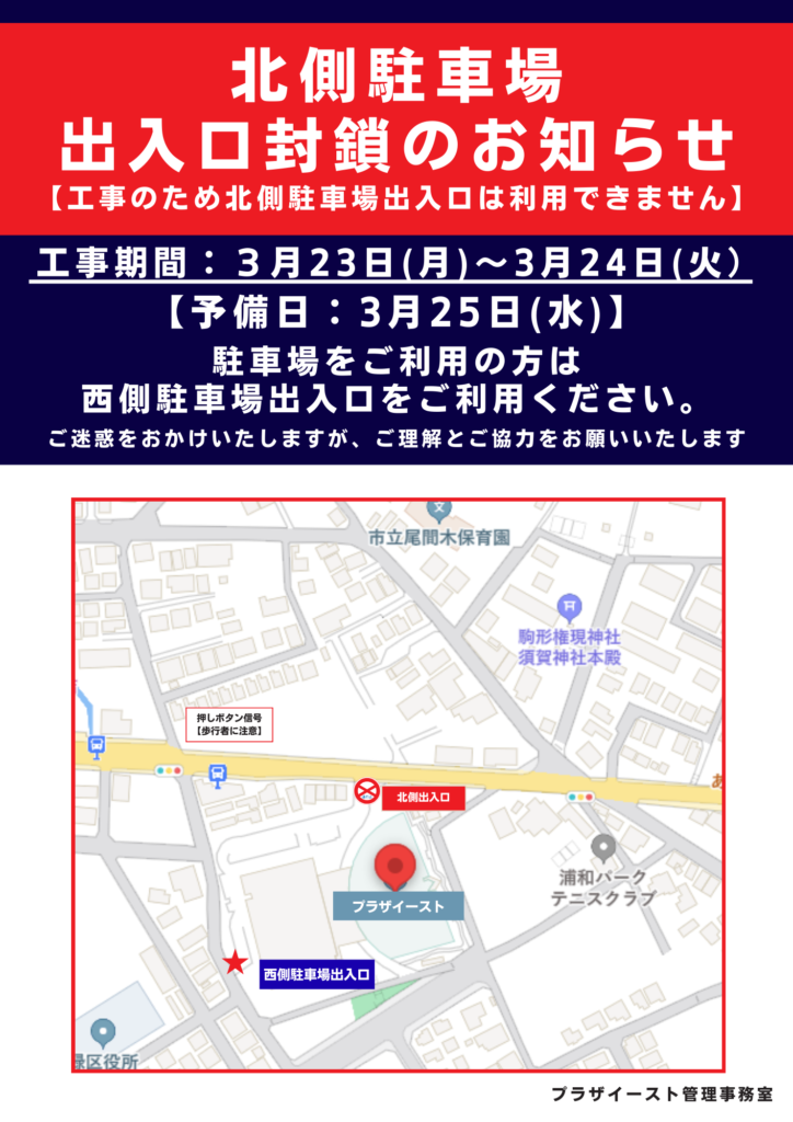 【プラザイースト】北側駐車場出入口封鎖のお知らせ